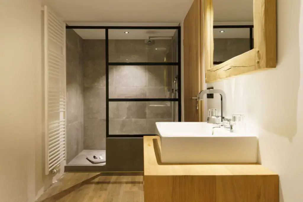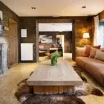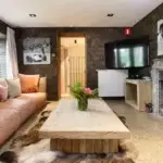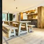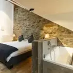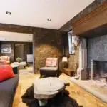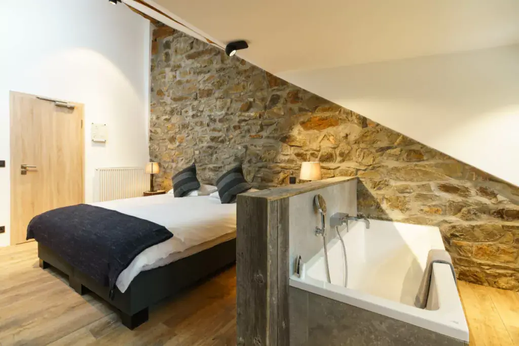 Cette ferme en carré a été rénovée avec goût, dans le respect des matériaux de la région. Les pierres naturelles de schiste parsèment les murs, quand ce ne sont pas des bardages en bois qui donnent un caractère chaleureux et cosy à ce lieu d’exception.