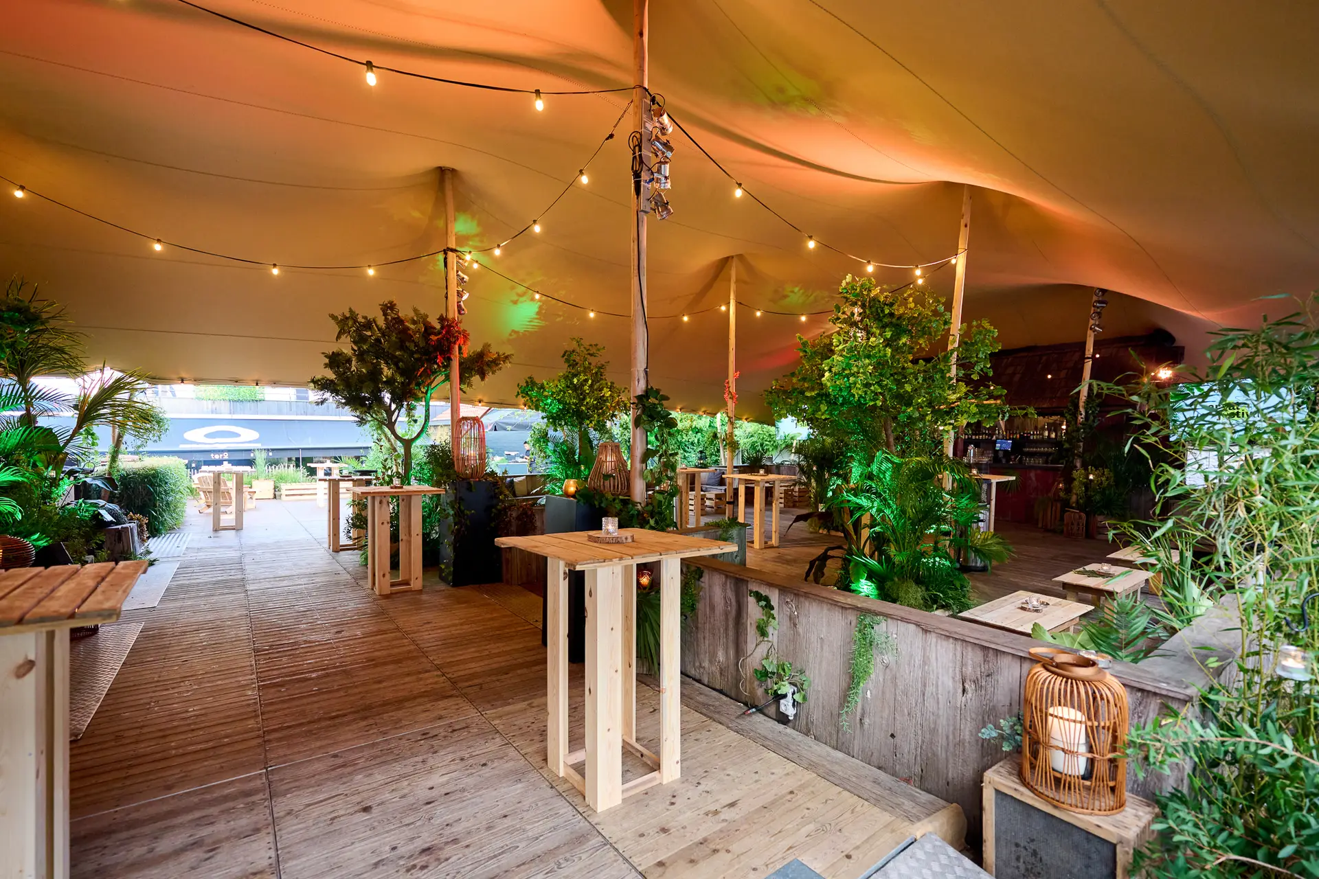 Un espace composé d’un intérieur (la salle événementielle) et d’une terrasse couverte par une tente organique. La salle événementielle, entièrement équipée, est prête à accueillir vos événements spéciaux. Elle peut accueillir jusqu’à 400 personnes en intérieur pour des soirées avec vos collègues ou amis, ou 150 personnes pour un dîner assis.